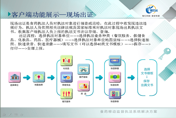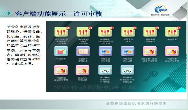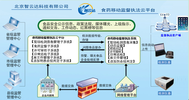 食藥移動監(jiān)督執(zhí)法系統(tǒng)是食品藥品監(jiān)督管理領(lǐng)域移動監(jiān)督執(zhí)法綜合服務(wù)系統(tǒng),主要用于食品藥品監(jiān)督管理部門移動監(jiān)管執(zhí)法使用。執(zhí)法人員可以手持客戶端現(xiàn)場檢測,錄像、錄音拍照等證據(jù)獲取,并依照法律法規(guī)對監(jiān)管對象進(jìn)行動態(tài)出證、等級評審、許可審核和日常巡檢等業(yè)務(wù)工作處理,并上報(bào)處理結(jié)果數(shù)據(jù)。監(jiān)管人員根據(jù)執(zhí)法采集的數(shù)據(jù),及系統(tǒng)自動收集到的輿情信息,實(shí)現(xiàn)了食藥監(jiān)管部門對所轄區(qū)內(nèi)的食品安全問題重點(diǎn)監(jiān)管工作。