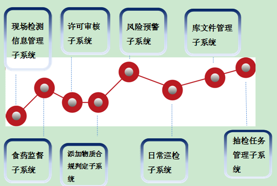 系統(tǒng)功能:現(xiàn)場檢測信息管理子系統(tǒng)、食藥監(jiān)督子系統(tǒng)、許可審核子系統(tǒng)、日常巡檢子系統(tǒng)、風(fēng)險(xiǎn)預(yù)警子系統(tǒng)、添加物質(zhì)合規(guī)判定子系統(tǒng)、庫文件管理子系統(tǒng)、抽檢任務(wù)管理子系統(tǒng)等八大版塊內(nèi)容主體。