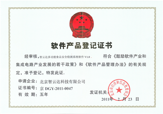 軟件產(chǎn)品登記證書——智云達多功能食品安全檢測系統(tǒng)軟件V1.0