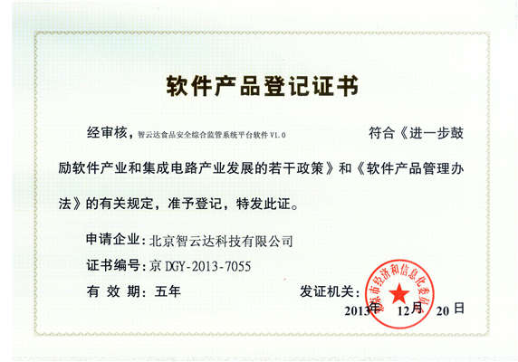 軟件產(chǎn)品登記證書——智云達(dá)食品安全綜合監(jiān)管體統(tǒng)平臺軟件