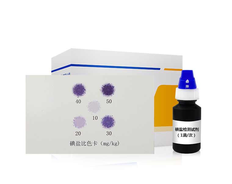 碘與碘鹽試劑反應(yīng)產(chǎn)生顏色,顏色深淺與碘含量成正比,與標(biāo)準(zhǔn)比色卡對比可確定碘含量。