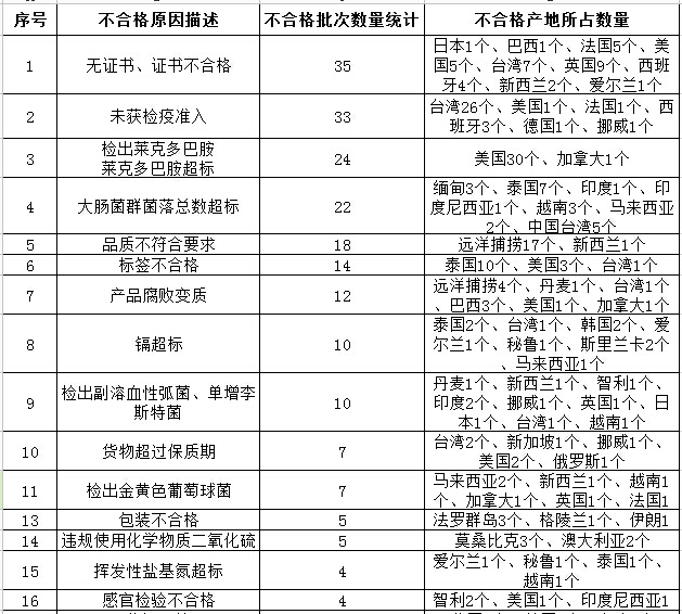 證書不合格、未獲檢疫準(zhǔn)入、檢出萊克多巴胺和菌落總數(shù)超標(biāo)為不合格主要原因。以上不合格產(chǎn)品均已依法做退貨、銷毀或改作他用處理,且未在國內(nèi)市場銷售。