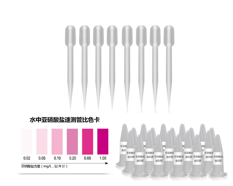 水中亞硝酸鹽與檢測(cè)試劑反應(yīng)生成紅色物質(zhì),含量越高顯色越深。