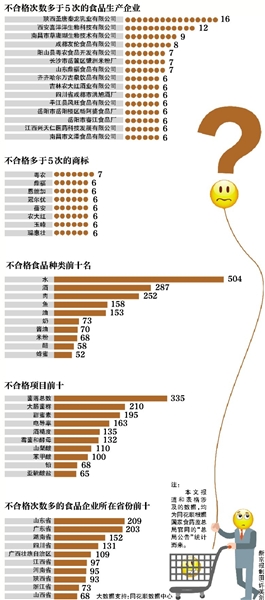 根據(jù)新京報(bào)統(tǒng)計(jì),自今年1月1日至11月26日,國(guó)家食藥監(jiān)總局在“總局公告”里公布了3600余批次不合格食品,有具名的“生產(chǎn)企業(yè)”2293家。根據(jù)同花順數(shù)據(jù)中心分析,449家企業(yè)被通報(bào)2次(含)以上,占19.6%。而被通報(bào)達(dá)5次及以上的企業(yè)數(shù)量為29家,占具名生產(chǎn)企業(yè)總數(shù)的1.3%。