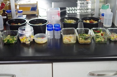 6組樣品分別是宮保雞丁,蠔油生菜,沙拉,菠菜炒雞蛋,蝦皮小白菜炒粉絲,土豆絲的隔夜菜以及所對應的新炒菜。