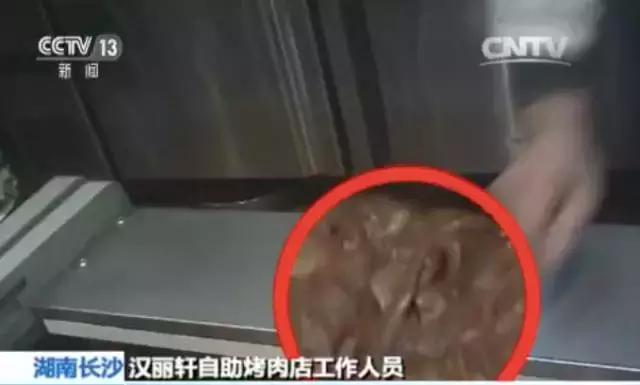 再來回顧一下,去年12月,湖南經視記者臥底長沙一家漢麗軒門店,就發現這家49元隨便吃的自助烤肉店,用鴨肉冒充牛肉,經過特殊醬料腌制后,顧客根本不會察覺。
