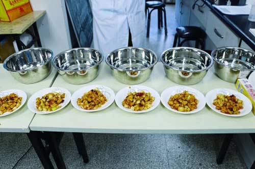 檢測用品:6個餐盤,外賣宮保雞丁兩份、小蘇打、洗滌靈、淘米水、吸油紙。