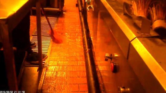 記者隨即被分配到廚房做一名配菜員,負責配置醬料和菜品原料。記者發現,廚房墻面和地面常常積累了污水和油漬,為了保潔,廚房師傅便不定期對墻面和地面進行刷洗和清掃,而在清掃之后,廚房師傅竟將掃把放入用于做菜的鍋內進行漂洗。見記者表情驚訝,旁邊的一名廚房師傅不以為然地說:“這里本來就是掃把洗鍋??!”
