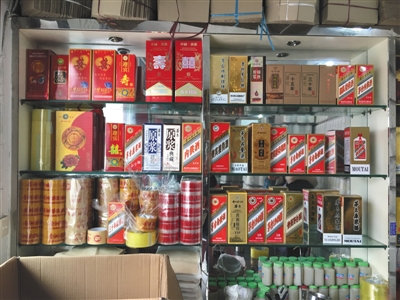 仁懷市興盛路一白酒包裝材料銷售商家柜臺上擺出的多種仿茅臺酒包裝。