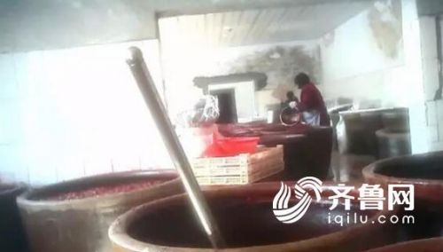 工作人員又帶記者參觀了蜜餞的腌制車間。在雜亂的車間內,擺放著很多大的陶瓷缸,里面是已經煮好的山楂,表面漂浮著很多白色的泡沫。工作人員說,這些山楂都是用木棍來攪拌的。