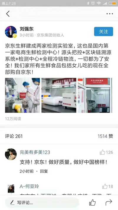 劉強東在個人賬號表示,“京東生鮮建成兩家檢測實驗室,這也是國內(nèi)第一家電商生鮮檢測中心。源頭把控+區(qū)塊鏈溯源系統(tǒng)+檢測中心+全程冷鏈物流,一切都為了安全!”