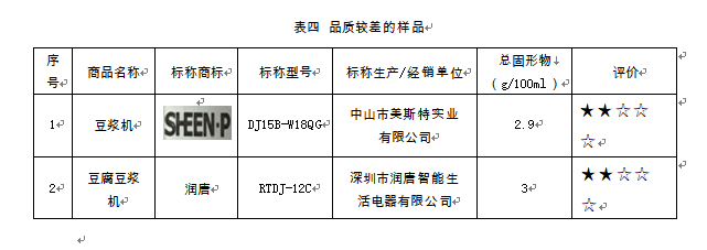 在對于豆漿品質的比較試驗中,總固形物數值越高表明豆漿品質越好。18件樣品中,總固形物最高的達到4.8g/100ml,最低的為2.9g/100ml,有5件樣品的總固形物在4.4g/100m以上。但有中山市美斯特實業有限公司生產的DJ15B-W18QG豆漿機和深圳市潤唐智能生活電器有限公司生產的潤唐RTDJ-12C豆腐豆漿機總固形物較低(見表四)。