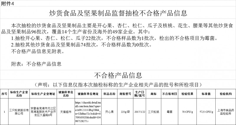 2017年8月15日,國(guó)家食品藥品監(jiān)督管理總局發(fā)布3批次食品不合格情況,其中就包括三只松鼠開(kāi)心果,而不合格的原因則為霉菌超標(biāo)。