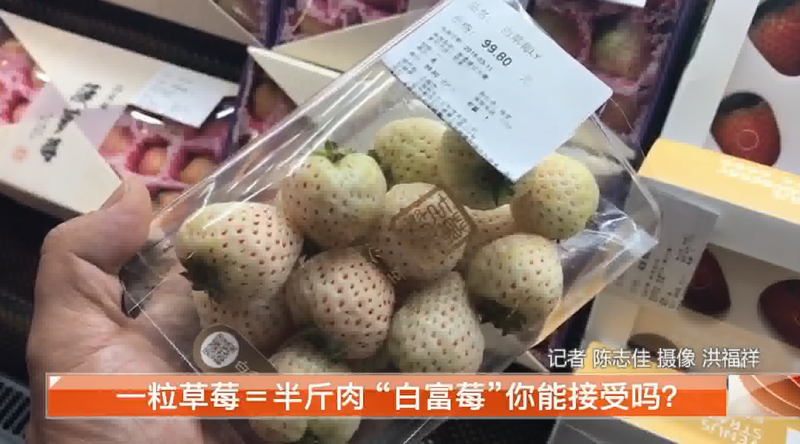 在蘇州園區(qū)的這家超市里,水果專柜上擺放著這樣的白色草莓,通體發(fā)白,帶著淡淡的粉,看上去有點不尋常,價格更是賣到了7塊錢一粒。而一旁,還有更貴的,這盒草莓個頭稍大,11顆價格近100元,每顆草莓算下來要9塊錢。而這些正是最近紅遍朋友圈的白色草莓,人稱“白富莓”。