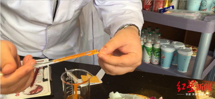 3月11日,紅星新聞記者來到這家火鍋串串店試吃。 將火鍋調(diào)料倒入鍋中后,兩名身穿白大褂的實(shí)驗(yàn)人員來到桌前,為記者現(xiàn)場檢測是否是老油。