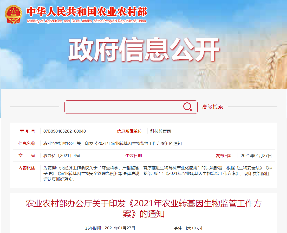 各省、自治區(qū)、直轄市農(nóng)業(yè)農(nóng)村(農(nóng)牧)廳(局、委),新疆生產(chǎn)建設兵團農(nóng)業(yè)農(nóng)村局: 為貫徹中央經(jīng)濟工作會議關于“尊重科學、嚴格監(jiān)管,有序推進生物育種產(chǎn)業(yè)化應用”的決策部署,根據(jù)《生物安全法》《種子法》《農(nóng)業(yè)轉(zhuǎn)基因生...[詳情]