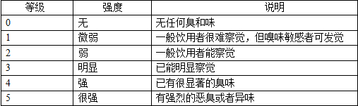 臭和味:去水樣100ml,置于三角瓶中,振搖后聞水的氣味,用適當(dāng)?shù)脑~句描述,并按六級記錄其強度。同時取少量的水入口,不要下咽,嘗嘗水的味道,并加以描述,按六級記錄其強度。