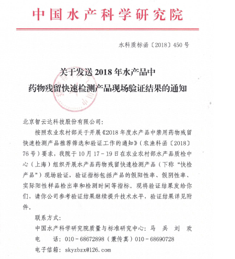 2018年10月17-19日北京智云達科技股份有限公司參加了由農(nóng)業(yè)農(nóng)村部漁業(yè)漁政管理局主辦,中國水產(chǎn)科學(xué)研究院承辦的“2018年水產(chǎn)品中藥物殘留快檢產(chǎn)品的驗證”工作。此次驗證在農(nóng)業(yè)農(nóng)村部水產(chǎn)品質(zhì)檢中心(上海)舉辦,現(xiàn)場來自21家快檢企業(yè)參加了驗證。這次驗證的項目包括氯霉素、呋喃四項、孔雀石綠等共六個項目,是近年來驗證項目最多的一次?,F(xiàn)場每個項目使用2個批次產(chǎn)品共檢測84個樣品,檢測指標(biāo)包括假陽性率、假陰性率、實際樣本檢出率和檢測時間等指標(biāo)。檢測結(jié)果包括專家評判和技術(shù)人員自評兩個環(huán)節(jié),評判結(jié)果表明智云達驗證的產(chǎn)品全部符合評價標(biāo)準(zhǔn)要求,特向市場推薦使用!