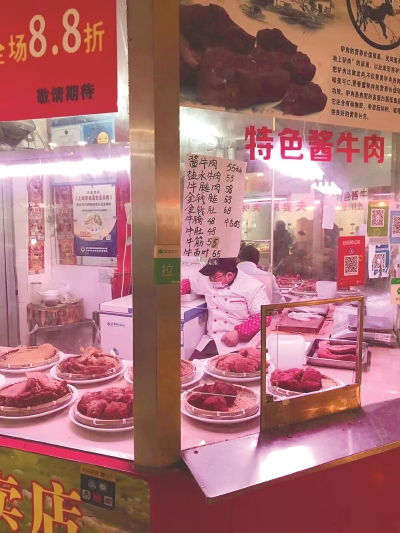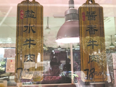 順著男店員的指點(diǎn),屠先生看到擺在桌上的醬牛肉和鹽水牛肉,的確品相都很不錯,屠先生選擇了鹽水牛肉。隨后,男店員揀出一塊適合屠先生大小要求的鹽水牛肉,放進(jìn)該店提供的盒里,將牛肉和盒子一起稱重:“鹽水牛肉58元一斤,你選的這塊一共是28.4元,夠嗎?”“夠了,就中午吃一頓。”屠先生說。