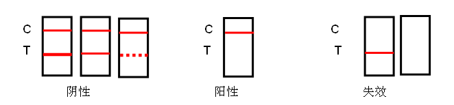 無(wú)效反應(yīng):C線不顯色,無(wú)論T線是否顯色,該檢測(cè)卡均判為無(wú)效。未出現(xiàn)C線,表明操作過(guò)程不正確或檢測(cè)卡已變質(zhì)失效。在此情況下,應(yīng)再次仔細(xì)閱讀說(shuō)明書(shū),并用新的檢測(cè)卡重新測(cè)試。