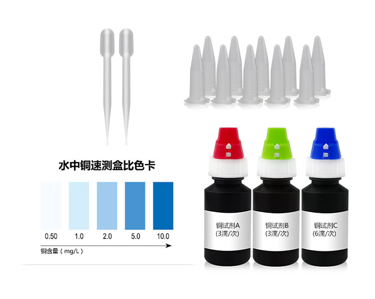 水中銅與檢測(cè)試劑反應(yīng)生成藍(lán)色化合物,含量越高藍(lán)色越深。