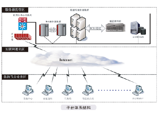 整個(gè)系統(tǒng)是建立在以互聯(lián)網(wǎng)連接為基礎(chǔ)的集中式業(yè)務(wù)處理系統(tǒng)。其總體結(jié)構(gòu)分為三個(gè)層:以服務(wù)器托管區(qū)服務(wù)器構(gòu)成的業(yè)務(wù)及數(shù)據(jù)處理中心、互聯(lián)網(wǎng)通訊區(qū)、中速及各地的業(yè)務(wù)處理節(jié)點(diǎn),層次結(jié)構(gòu)圖如左所示: